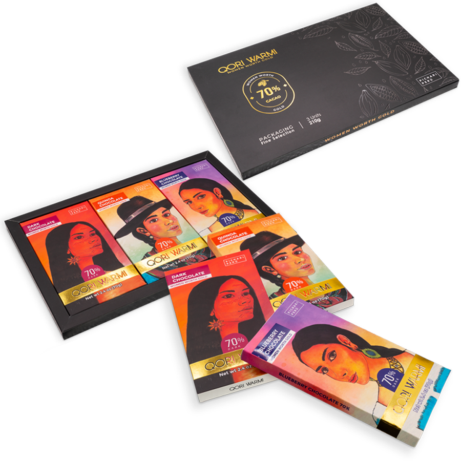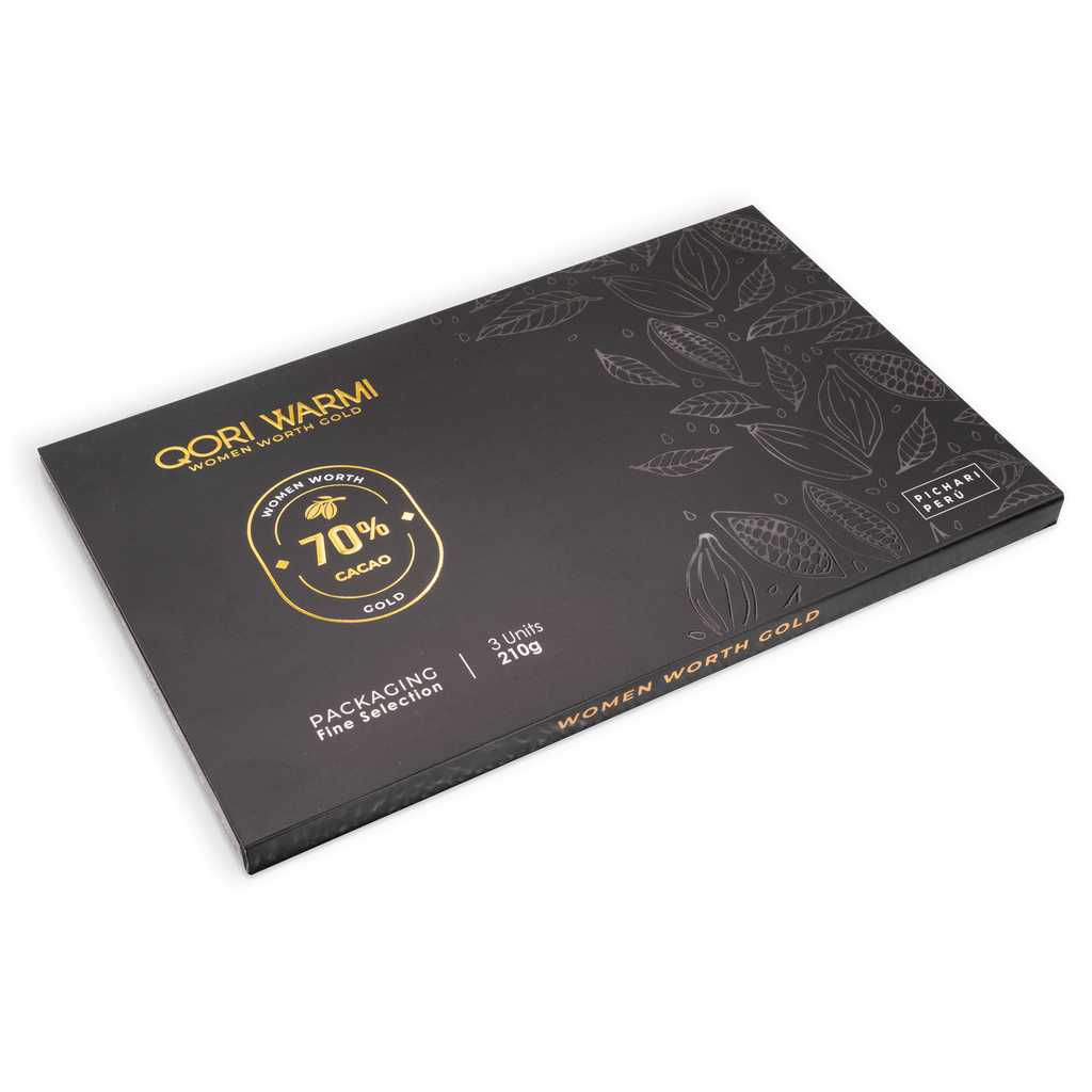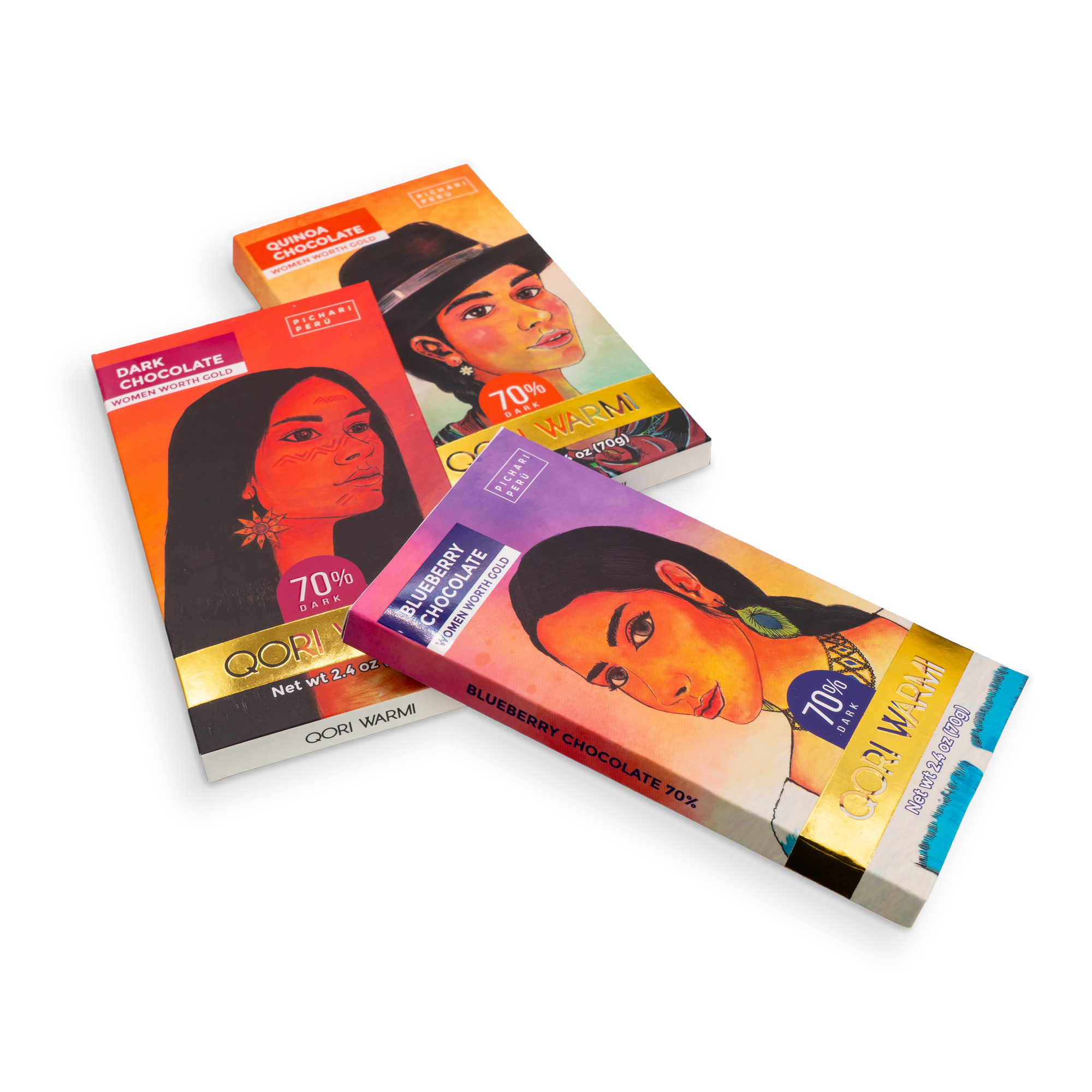 A rich, beautifully packaged trio of 70% dark chocolate bars that makes an easy, meaningful gift - handcrafted by the women of the Qori Warmi cooperative.